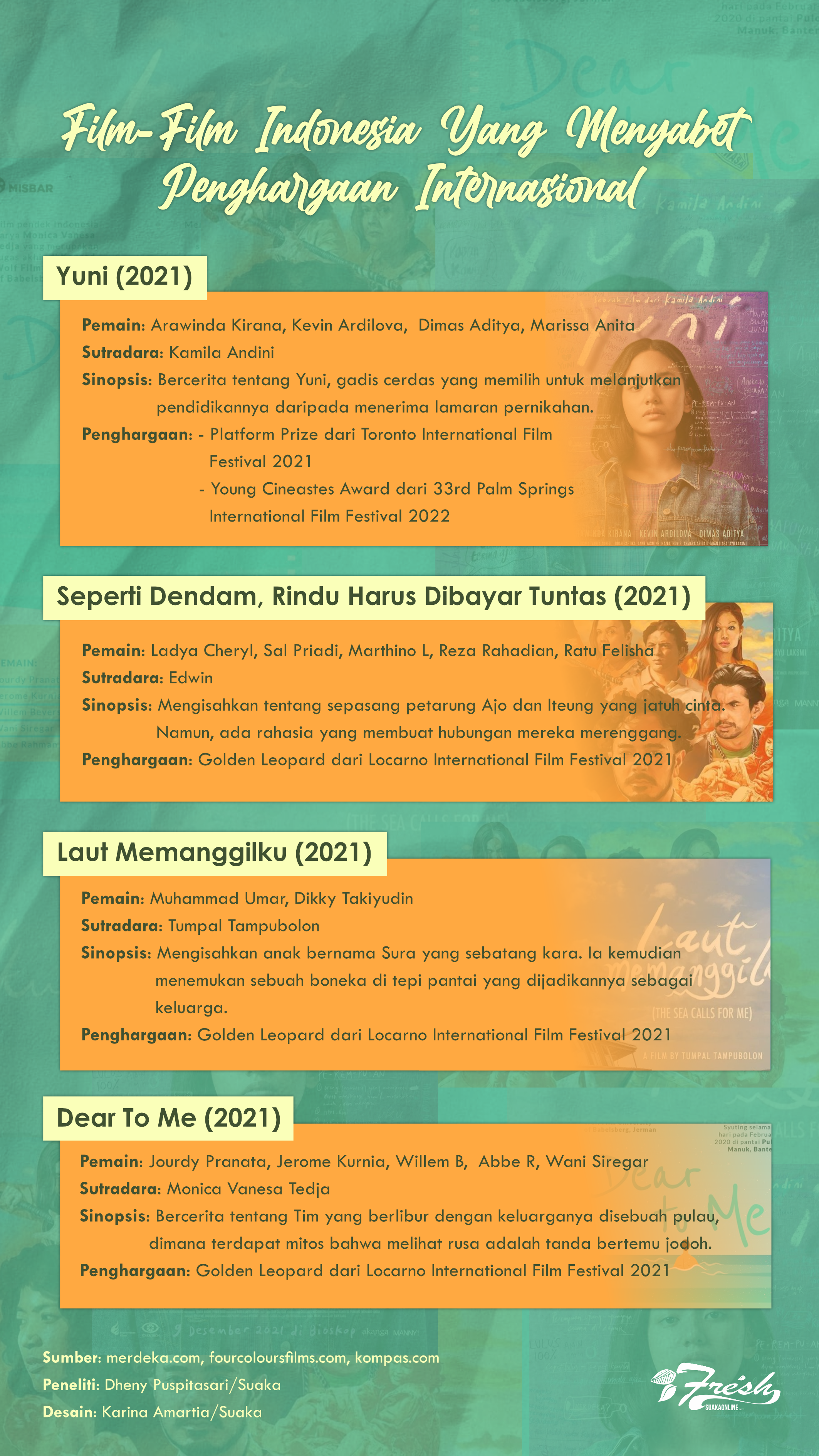 FRESH.SUAKAONLINE.COM, Freshgrafis – Halo Fresh Readers! Masih ingatkah kalian tentang film Yuni yang beberapa waktu lalu sempat viral? Ya, film yang berkisah tentang perempuan yang berambisi untuk melanjutkan pendidikannya ini sudah menyabet penghargaan di kancah internasional, lho! Nah, untuk penghargaan film berkelas internasional ini sendiri umumnya disebut International Film Festival.