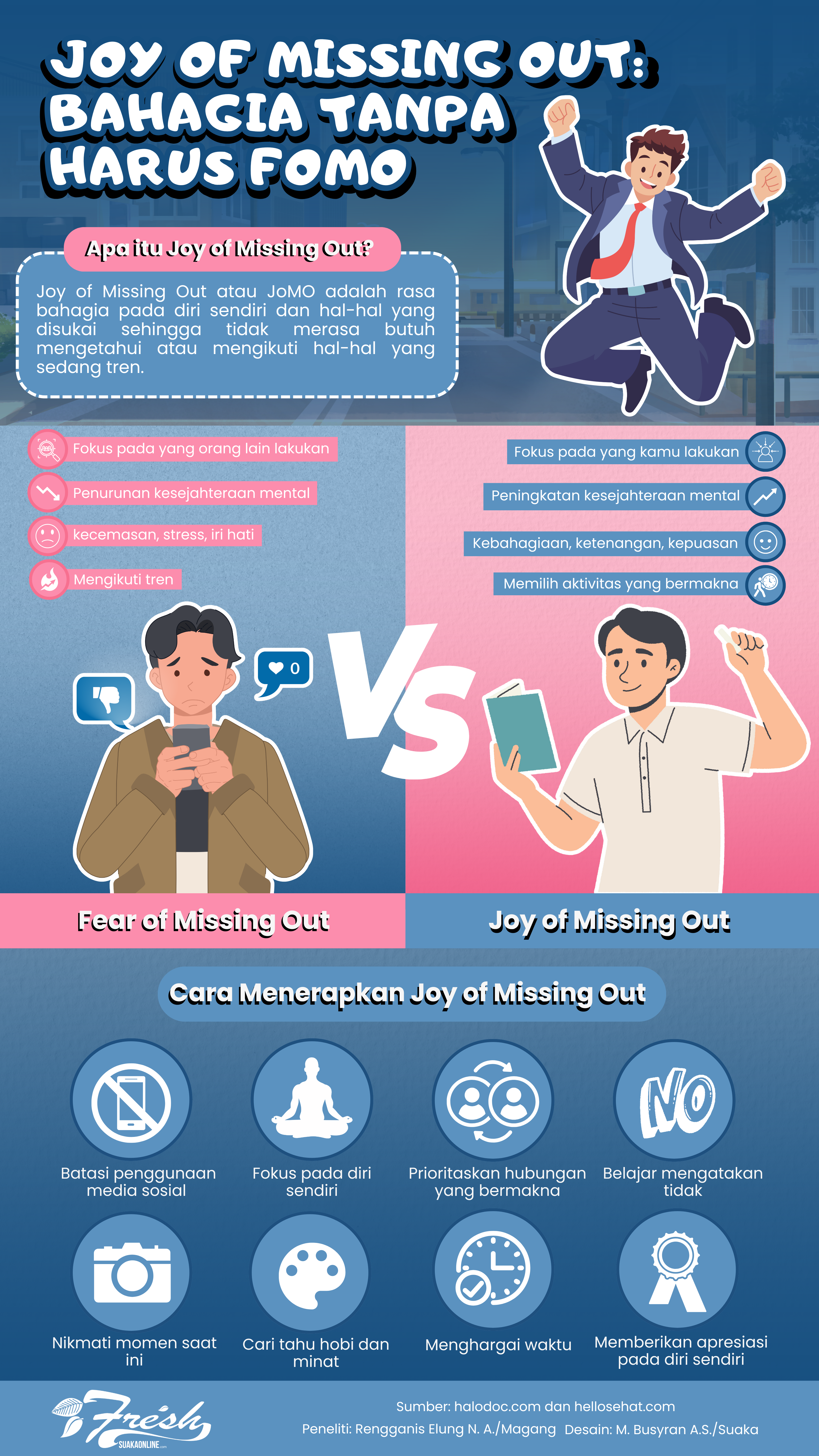 Demikian cara-cara yang dapat dilakukan untuk mengurangi FOMO dan meningkatkan JOMO. Jadi, jika Fresh Reader sudah mulai bisa menahan diri dari keinginan untuk selalu update, dan lebih menikmati hidup apa adanya, selamat! Itu tandanya fresh reader sudah mulai menerapkan JOMO. Pertahankan ritme ini agar hidup terasa lebih ringan, tenang, dan tentu saja, lebih membahagiakan.